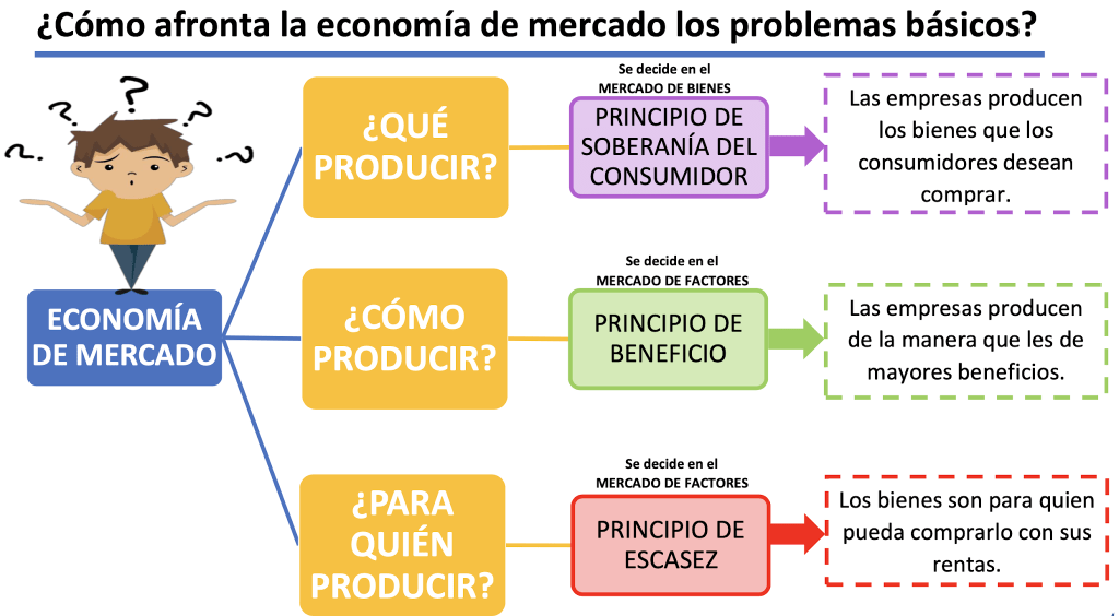 Un sistema económico de mercado es aquel en el que las decisiones económicas de una nación son el resultado de las decisiones individuales de compradores y vendedores en el mercado. Estados Unidos y muchos países europeos tienen un sistema económico de mercado. Al terminar la escuela, puedes trabajar donde elijas, si hay una vacante. También tienes la libertad de emprender tu propio negocio. Supongamos que decides abrir un negocio. Arriesgarás el dinero que has ahorrado o pedido prestado con la esperanza de tener éxito. El éxito que alcances dependerá de la demanda de tus productos por parte de los consumidores.