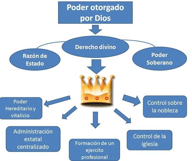 Como justificación a este tipo de monarquía se estableció que el poder emanaba de Dios y que el monarca ejercía dicho poder sin necesidad de ninguna limitación jurídica. Por ello, la Iglesia operaba de “intermediaria” entre Dios y el Rey, y se asumía que el Rey era naturalmente bueno, correcto y justo.